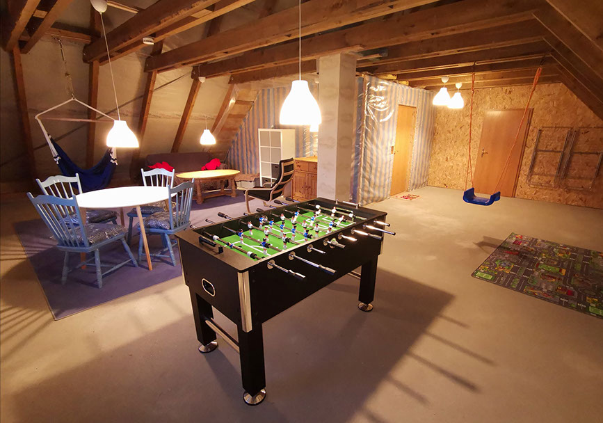Die Kids und auch die Erwachsenen können sich insbesondere abends und bei nicht so "dollem" Wetter auf ein 35 m² Spielzimmer mit Tischkicker, Schaukel, Spielsachen und Chillecke freuen.