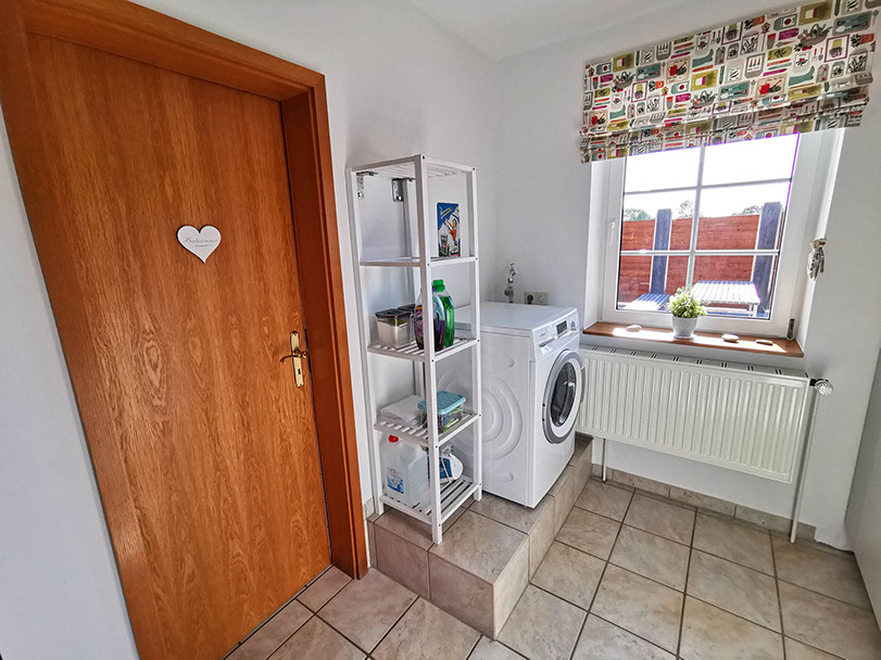 Das Haus hat einen Hauswirtschaftsraum mit Waschmaschine, Bügelbrett und Bügeleisen.