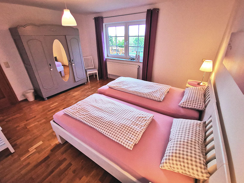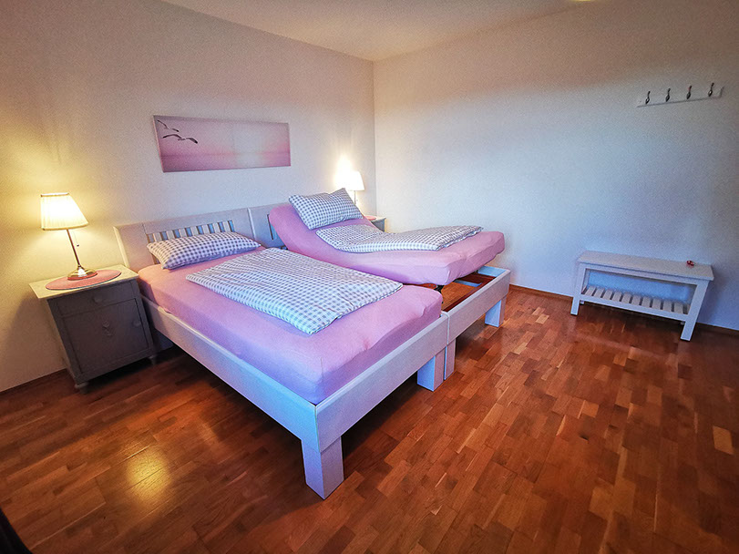 Schlafzimmer 1 hat zwei Einzelbetten in Komforthöhe, eines davon mit elektrisch verstellbarem Lattenrost (wie ein Pflegebett). Schlafzimmer 2 hat ein Doppelbett in Komforthöhe.